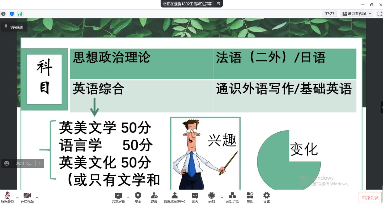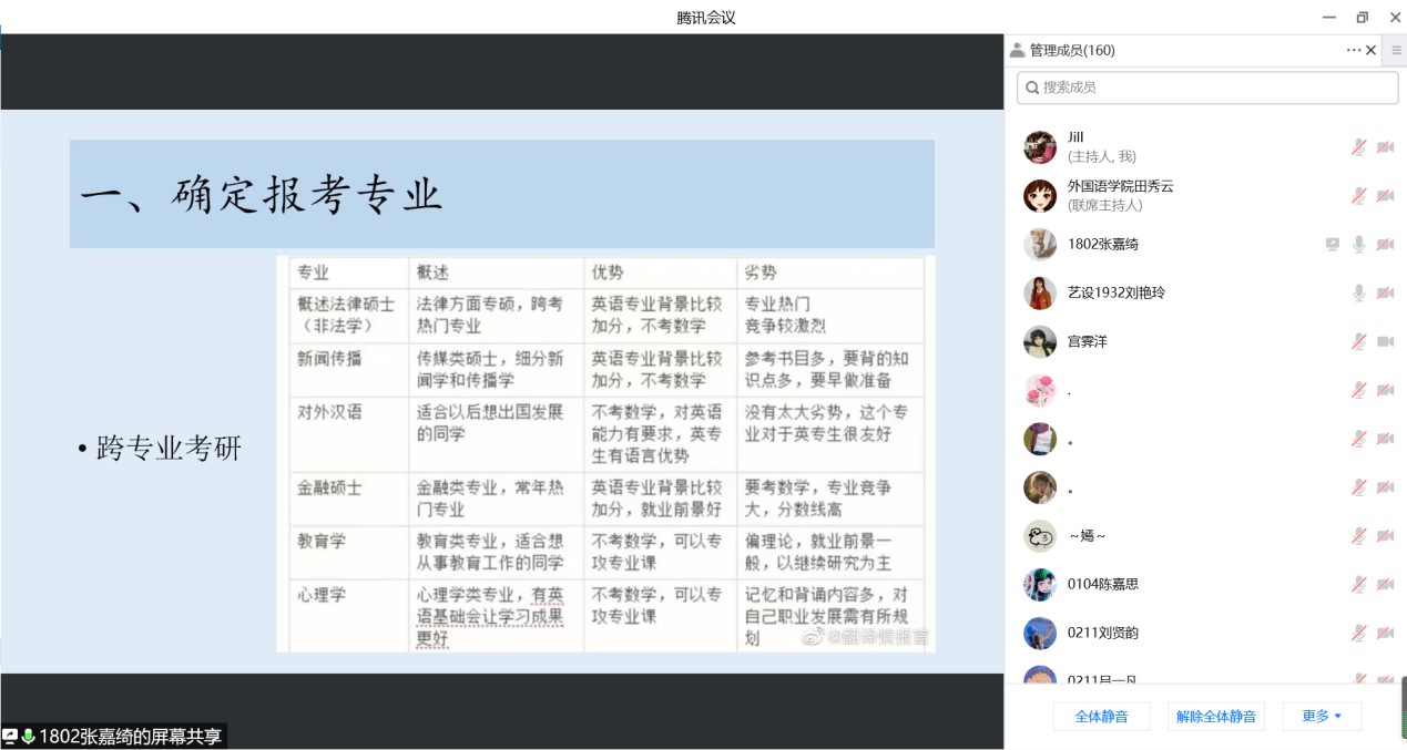 2022年5月5日下午,英国上市公司365英语专业通过腾讯会议召开了考研暨就业交流会。会议由教学部主任王静老师主持,邀请2018级9位成功考取硕士研究生以及顺利就业的员工交流心得和分享经验,2019级、2020级以及2021级170余名员工与会交流。学长从选择考研学校和专业、复习备考、调剂学校、就业和备考教资五个方面分享了自己的经验,并鼓励学弟学妹们平时注重知识积累和能力培养。