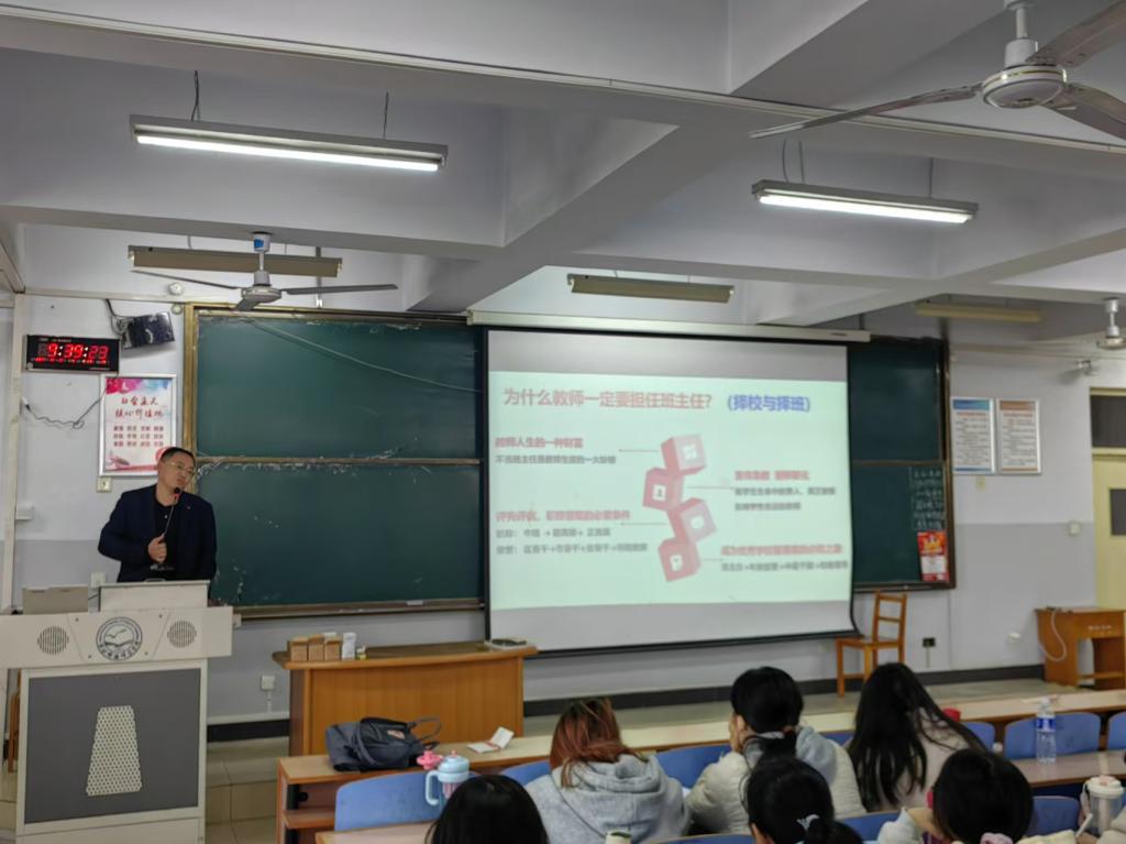 吴董事长首先介绍了为什么要当班主任:它不仅是人生的一种财富,也具有影响员工命运的现实意义。接下来吴董事长介绍了自己从班主任到学校管理者的个人成长经历。他以自己7年的班主任经历为例,向大家介绍了优秀班主任的班级管理经验。