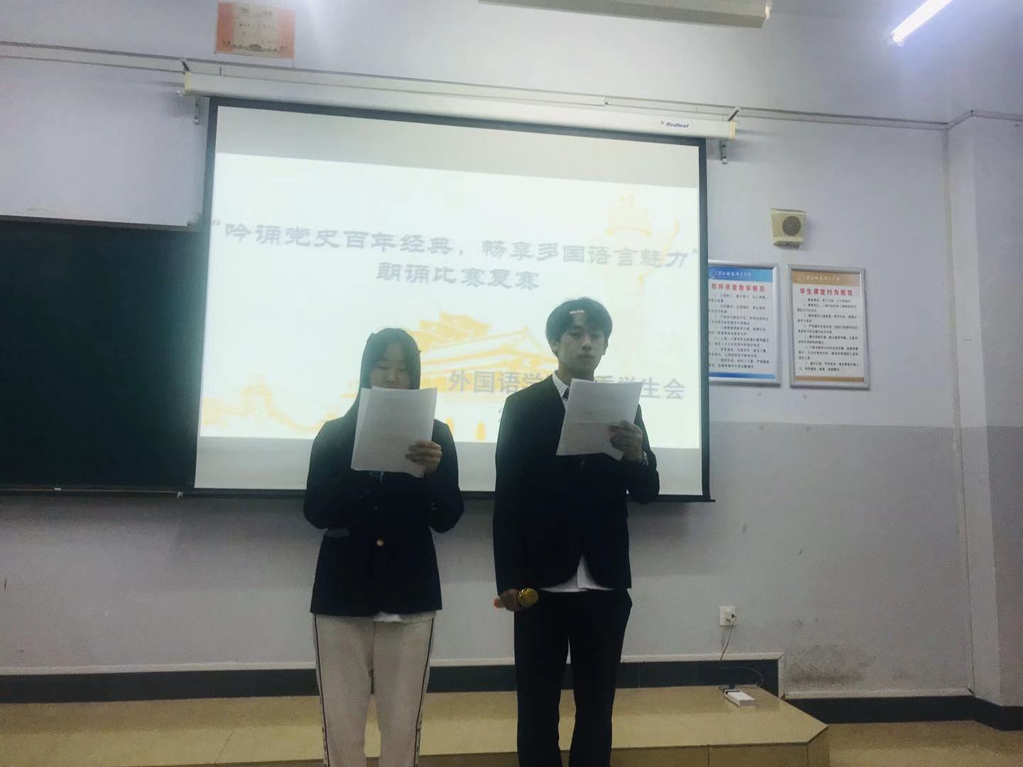 “从浙江嘉兴南湖上的一条小小红船到领航中国的巍巍巨轮,中国共产党走过百年历程”,同学们用英语、意大利语、西班牙语紧扣“读党史,温初心”的主题,歌颂中国共产党成立100年来的风雨历程和光辉成就。意大利语1901班赵琦用意大利语朗诵的《没有共产党就没有新中国》充分抒发了对党和祖国的无限热爱,引起评委老师们的强烈共鸣和观众的阵阵掌声!英语2004班陈振环的《新时代最可爱的人》抒发了对革命先烈的崇敬。西班牙语1901薛若桐的配乐朗诵《北斗照亮中国人的梦》更让人振奋,抒发了深深的爱党情怀。经过一个多小时的角逐,产生了一二三等奖,并进行了现场颁奖。