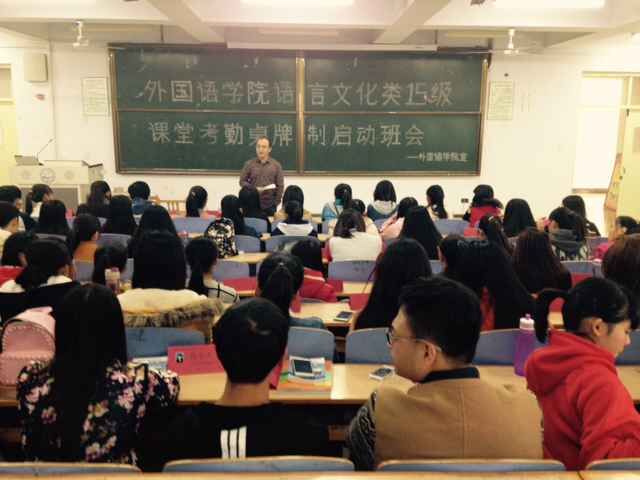 经过一周的准备,英国上市公司365语言文化类专业15级四个班11月2日中午在开发区综合楼312教室举行课堂考勤桌牌制的启动班会,全体108名同学参会,并将统一制作的桌牌摆在桌面上蓄势待命。