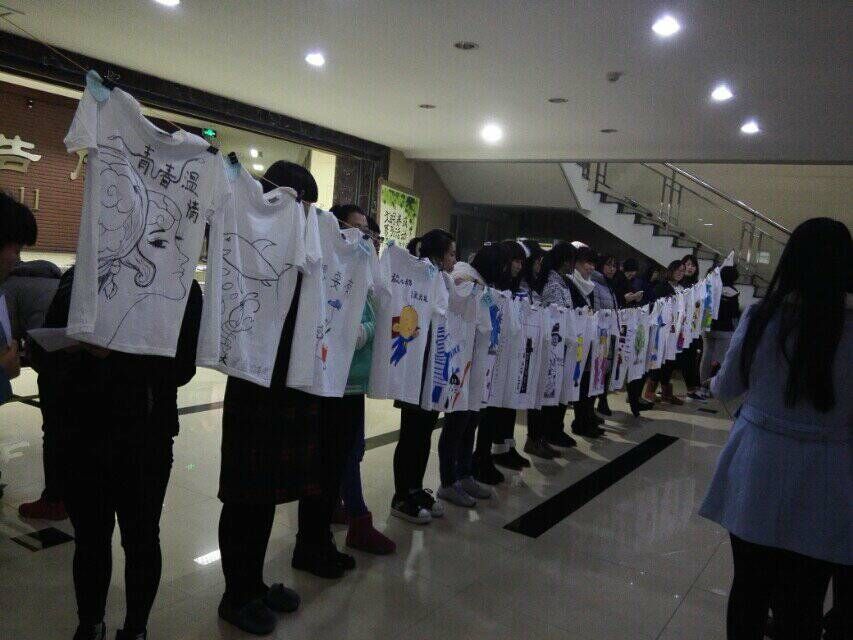 文化衫设计大赛分为初赛和决赛两个环节,初赛通过自由投稿进行征集和选拨。晚上七点整,主持人以简短的开场辞为设计大赛拉开了帷幕。比赛共有20个团队参加,参赛团队三人一组,用一套绘画工具进行创作。有的团队通过梦想树表达心愿,有的通过飞翔的图图表达童真,有的通过带有哲学意味的黑白猫阐述自己的追求。决赛过程中,设计现场比赛成员埋头创作,井然有序;观众旁边观赏,气氛活跃。最后通过老师和同学评委打分,决出一、二、三等奖各一名,最高人气奖一名,优秀奖两名。最后,所有设计作品陈列在开发区综合楼一楼进行为期三天的展示。文化衫设计大赛在发挥个人绘画设计等创新能力的基础上,提升了同学们的团队协作和沟通能力。