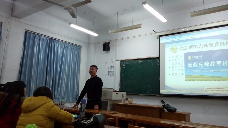 北京摩凯先锋教育机构创办于2008年,累计培训学员近30000人次,是北京通州区规模第一,北京市前十的民办教育培训机构。董事长侯峰首先向毕业生介绍了学校目前的发展情况,同时,就毕业生关系的教师待遇、住宿条件、休假福利等问题进行了一一说明。之后,侯董事长和大家分享了自己创业的体会,希望毕业生同学们将自己的专业变成价值,把实力变成财富;努力把简单的事情做好就是不简单,把平凡的事情做好就是不平凡,学校也将努力发展,打造北京中小学英语教育第一品牌,为入职员工的发展和成长提供更好的平台。最后,摩凯先锋教育培训机构的李副董事长和两位年轻教师与毕业生们分享了在北京摩凯先锋教育学校的工作生活和学习情况,并展示了自然拼音法、直接母语式教学法、TPR肢体反应教学法等特色的英语教学方法。