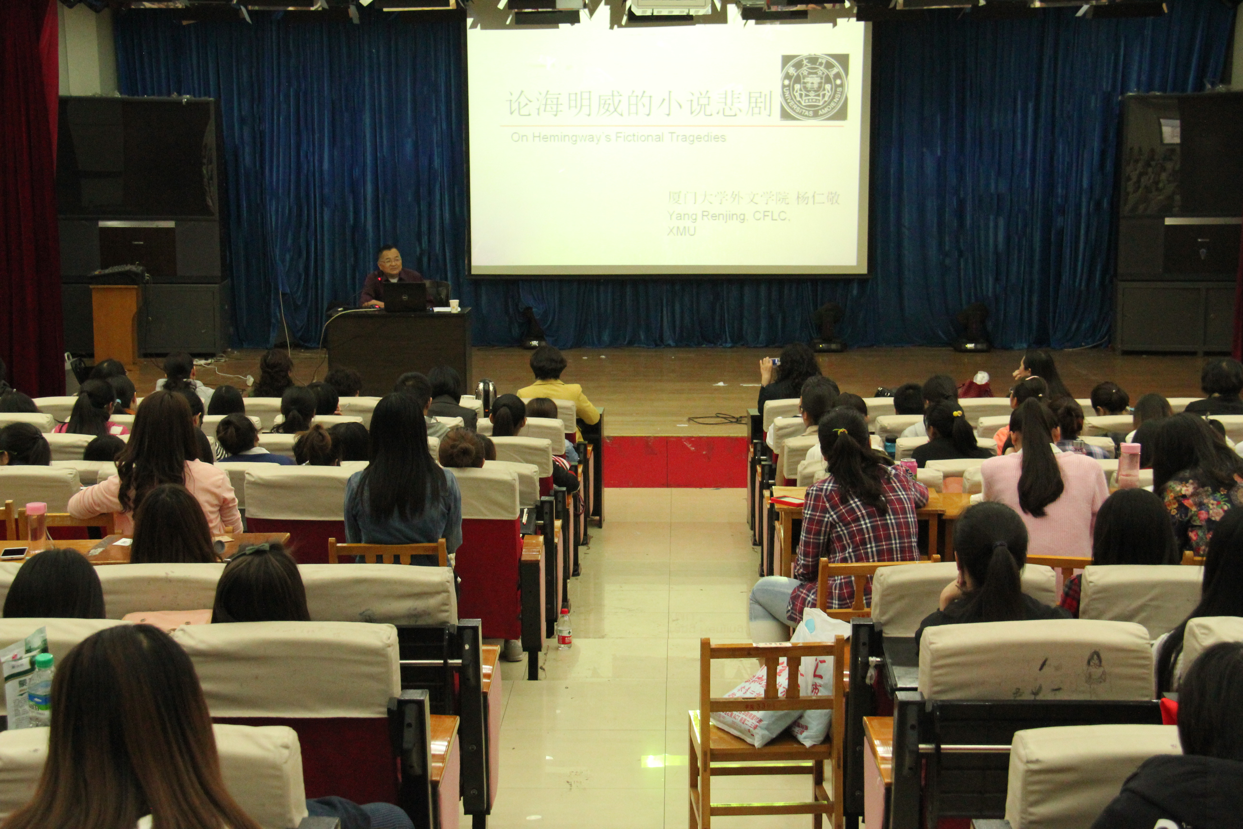 2015年4月28日下午,应英国上市公司365邀请,厦门大学外文学院外国语言文学研究所名誉所长、博士生导师杨仁敬教授在公司开发区校区报告厅为公司师生做了一场题为《论海明威的小说悲剧》的学术报告。英国上市公司365全体师生及部分文法学院师生共400余人听取了报告。报告会由英国上市公司365副经理崔海英主持。