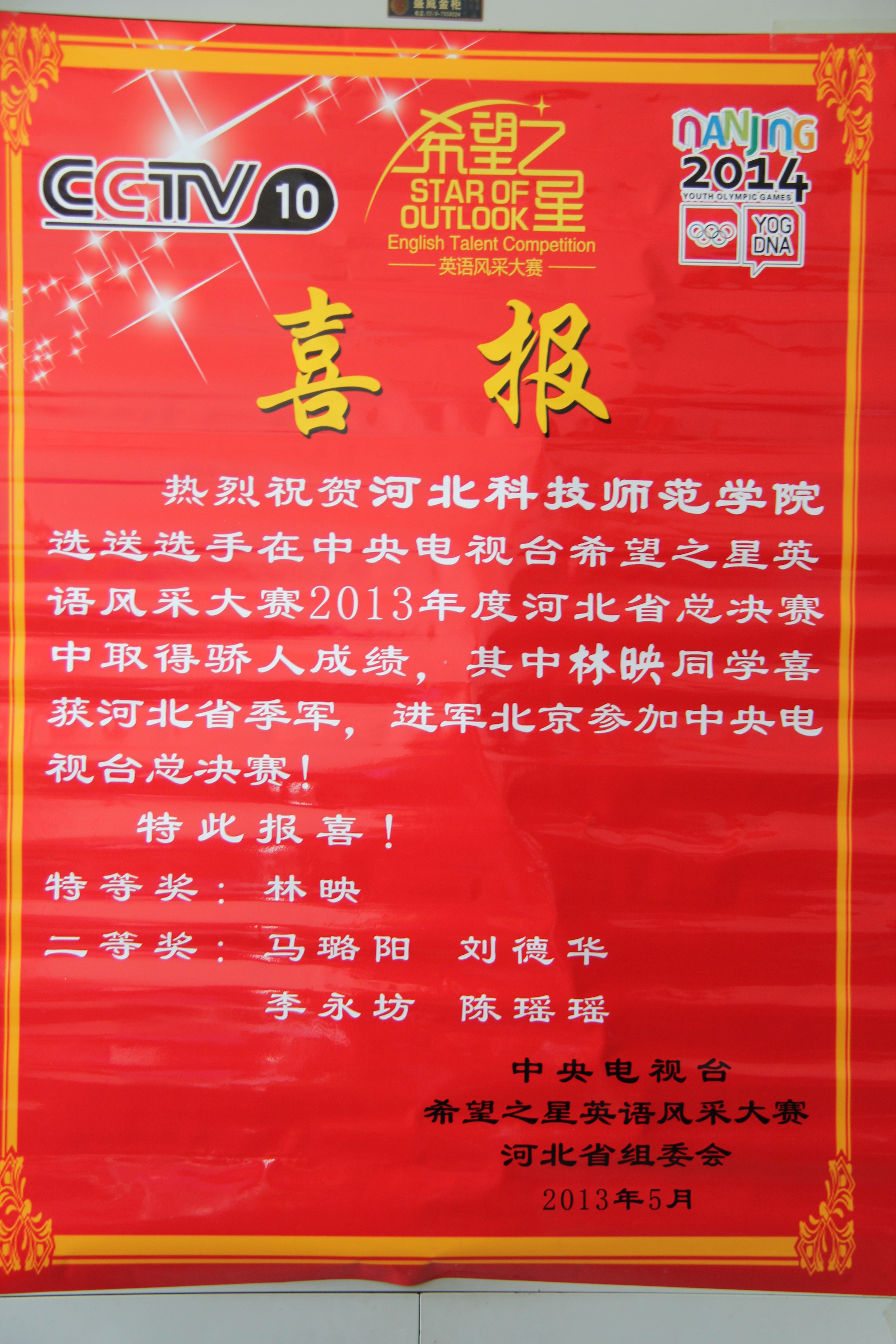 公司选手在河北省希望之星英语风采大赛总决赛中表现优异,其中英国上市公司365员工林映获得河北省季军,将进军北京中央电视台参加总决赛。另有马璐阳、刘德华、李永坊、陈瑶瑶四名同学获得二等奖。