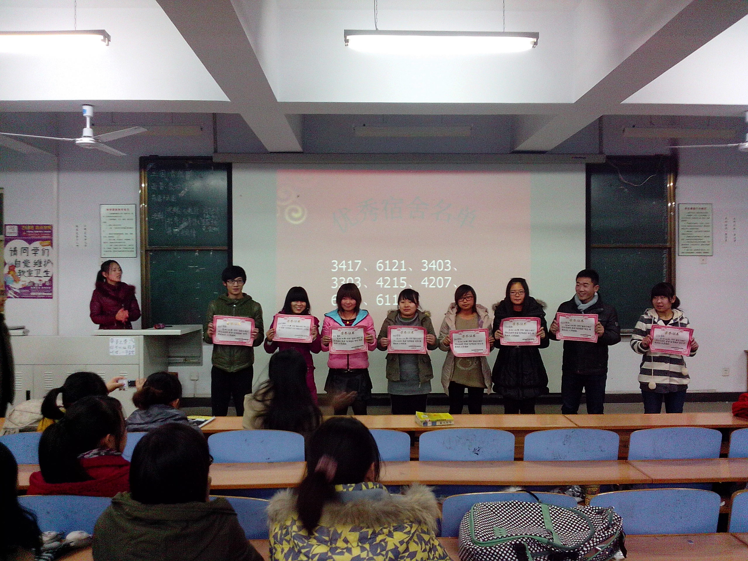 本次表彰大会共评出优秀文明宿舍8个,分别是3417、6121、3403、3303、4215、4207、6107、6112。大会向同学们展示了优秀宿舍的照片,田辉老师为获奖宿舍颁发奖状,并作了简要讲话。大会还成立了由学工办老师和员工会组成的宿舍督查小组,将不定期对学院宿舍内务情况进行抽查。